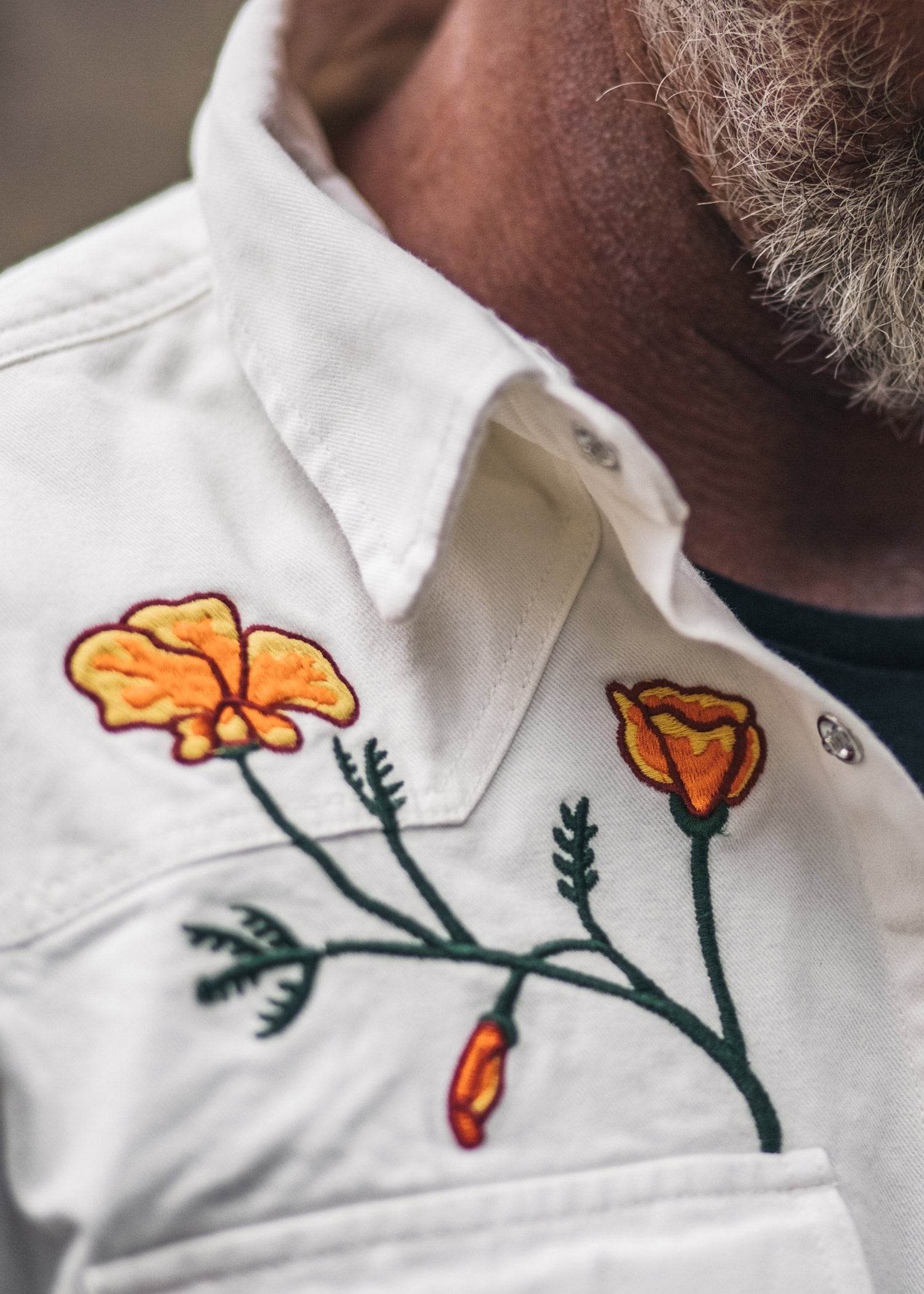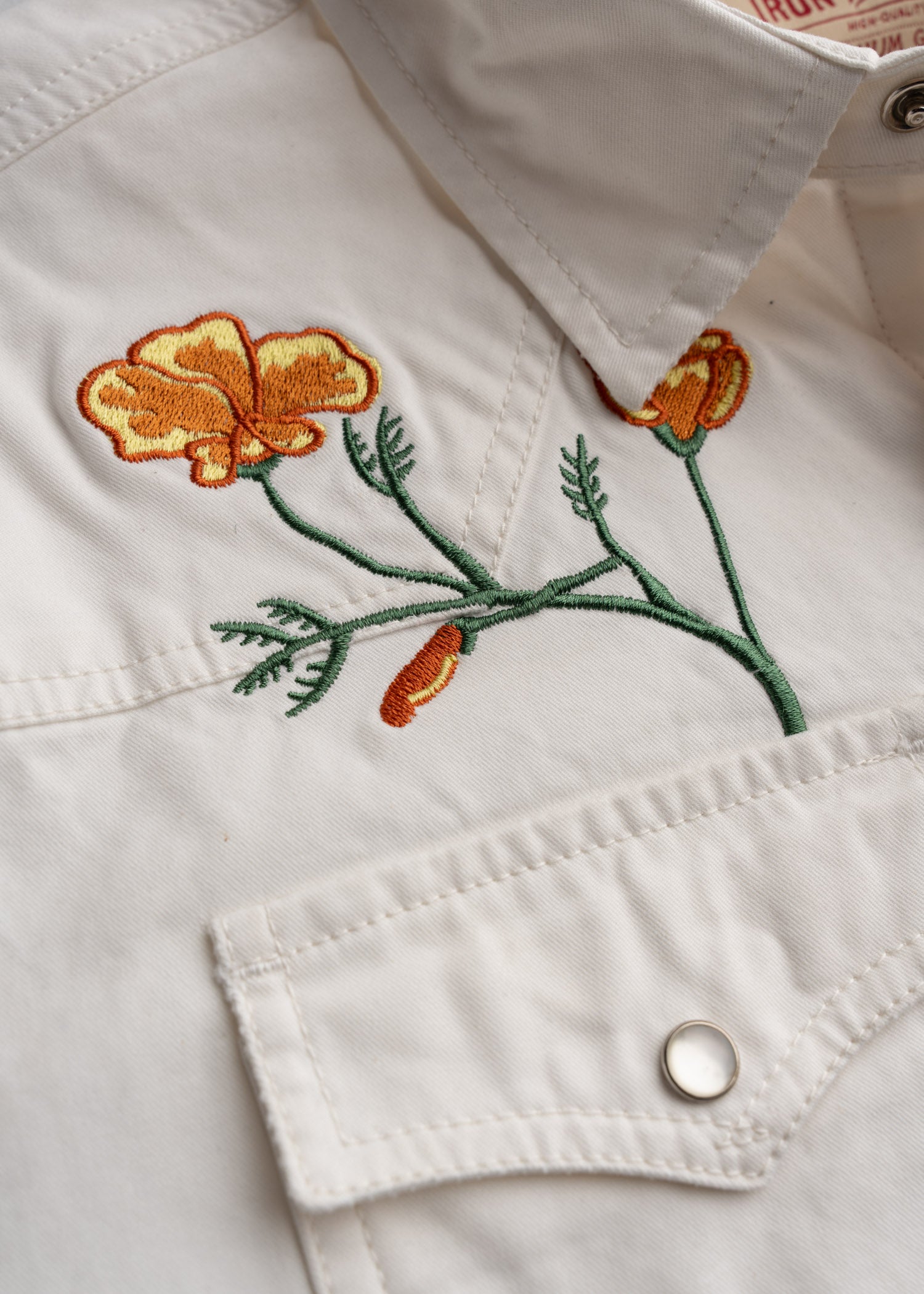 Not many items of clothing are as practical as a true western snap shirt. We made the Field Shirt from a sturdy 6.6oz cotton twill built to withstand a beating. We then bleached it and topped it off with embroidery of our custom California Poppies design to pay homage to the state we know, love, and call home.